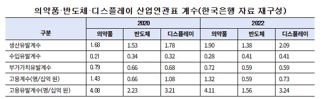 이에 따르면 한국은행이 제시한 2020년과 2022년 산업연관표를 이용, 반도체·디스플레이·의약품 등 3개 국가첨단전략산업간의 연관관계를 수량적으로 분석한 결과 부가가치 및 고용유발효과에선 의약품산업이 가장 높은 것으로 분석됐다. 한국은행 산업연관표에서 계수 확인이 불가능한 이차전지산업을 제외하고 3개 국가첨단전략산업간 비교를 한 결과 생산유발효과는 디스플레이-의약품-반도체순으로 파악됐다.