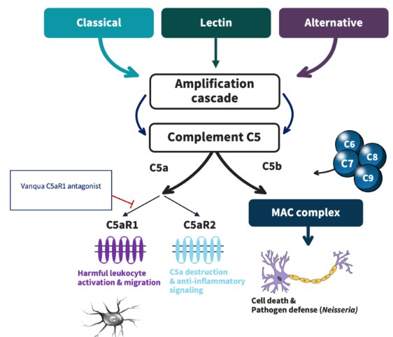 C5aR1은 보체(補體) 성분 5a 수용체 1(complement component 5a receptor 1)의 약자이다. 특히 호중구 매개질환에서 조직 염증에 관여하는 면역 연쇄반응(immune cascade)의 핵심 구성 요소를 촉진하는 데 중추적인 역할을 한다. 이에 대한 길항제는 보체 유발 염증 작용을 완화시킬 수 있다. C5aR1 길항 작용은 상류 보체 구성요소 신호전달을 억제함으로써 병원균 방어(예 임질균) 및 손상된 세포의 유익한 제거에 중요한 구성 요소의 작용을 보존하는 효과가 있다.  C5aR1 길항제의 약리기전(반쿠아바이오 홈페이지)C5aR1 길항제는 생명을 위협하는 신장질환에서 스테로이드 사용을 줄이는 것으로 입증됐다. 중추신경계에서 비정상적인 C5aR1 활성화는 중추신경계 면역세포의 유해한 활성화를 촉진하여 세포 기능 저하 및 세포 사멸 증가로 이어진다. 따라서 C5aR1 길항제는 중추신경계에서 알츠하이머병을 포함한 여러 질환에서 신경 염증을 감소시키고 질병 진행을 늦출 수 있다. 말초신경계에서도 보체 매개 염증 질환을 감소시킬 것으로 예상된다.