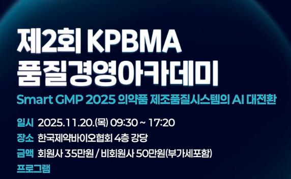 한국제약바이오협회가 오는 11월 20일 협회 4층 강당에서 ‘제2회 KPBMA 품질경영 아카데미’를 개최한다. 이번 행사는 ‘Smart GMP 2025: 의약품 제조품질시스템의 AI 대전환’을 주제로, 제약바이오 업계 종사자들이 AI·빅데이터·로봇 기술을 활용한 규제 및 리스크 관리 방안을 공유한다.