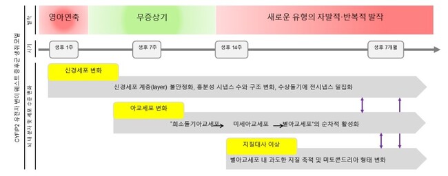 연구팀은 웨스트증후군 환자에서 반복적으로 보고된 CYFIP2 유전자 점변이(p.Arg87Cys)를 갖는 생쥐 모델을 대상으로, 생애 초기 영아연축 발생 시점부터 생후 7개월령까지의 전 과정을 장기적으로 추적 분석했다. 생쥐 모델은 생후 1주일경 영아연축이 나타난 뒤 발작 증상이 사라지고, 이후 약 3개월간의 무증상기를 거쳐 생후 14주(사람의 성인기에 해당) 무렵부터 새로운 형태의 자발적 발작이 다시 발생했다. 또 생후 7개월까지 발작의 빈도와 강도가 점차 증가하는 양상을 보였다.