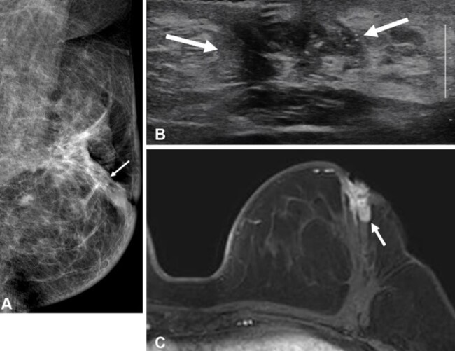 유방 MRI는 유방암 검사 중 가장 민감도가 높아 유방촬영술과 초음파에서 놓친 종양도 탐지할 수 있다. 그러나 젊은 환자의 수술 전 MRI 검사가 장기적 예후에 미치는 영향, 특히 호르몬 수용체 상태에 따른 영향은 명확히 규명되지 않았다. 수술 전 MRI 검사를 시행하지 않은 50세 이하 환자의 수술 2년 후 유방 영상 검사 결과. (A)유방촬영술 (B)유방초음파에선 동측 유방 내 재발이 발생함. (C)MRI에선 발견되지 않음