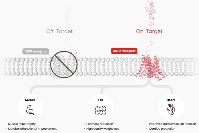 CRF family는 스트레스 반응 및 스트레스 회복과 관련된 신호 분자로, 그 수용체 중 CRF2 수용체를 선택적으로 타깃하면 지방 감소와 근육 증가, 근기능 개선 등을 직접 이끌어낼 수 있다는 게 한미약품 설명이다.