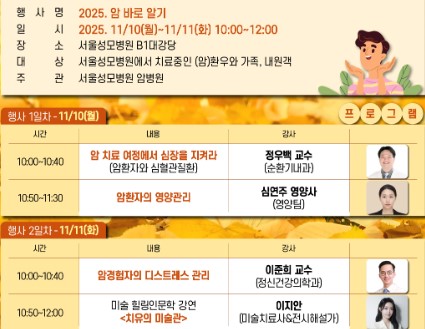 프로그램 첫날에는 정우백 순환기내과 교수가 ‘암 치료 여정에서 심장을 지켜라(암환자와 심혈관질환)’를 주제로 강연한다. 암 치료 중 발생할 수 있는 심혈관계 합병증의 위험과 예방 관리법을 다룬다. 이어 심연주 영양사가 ‘항암치료 중 영양 균형 유지와 회복기 식단 관리’에 대한 실질적 조언을 전한다.