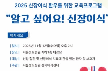 가톨릭대 서울성모병원 장기이식센터는 오는 12일 오후 2시, 본관 지하 1층 대강당에서 2025 신장이식 환우를 위한 교육프로그램 ‘알고 싶어요! 신장이식’을 개최한다.