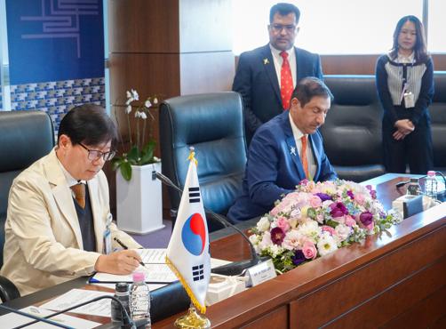 이지열 서울성모병원장(왼쪽)과 살레 알 아브리(Saleh S. Al Abri) 오만군병원장 이 의료협력 양해각서(MOU)에 서명하고 있다.
