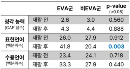말하기 능력을 평가하는 표현언어 검사에서 EVA군은 백분위수 41.8을 기록해 또래 평균 수준(50)에 근접했으며, 비EVA군(백분위수 20.4)과 유의미하게 큰 차이를 보였다. 듣고 이해하는 능력을 측정한 수용언어 검사에서도 EVA군이 더 우수한 경향을 보였다. EVA군과 비EVA군의 보청기 재활 전후 언어 및 청각발달 비교