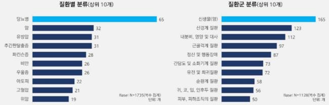 • 암 관련 질환군 165개로 최다 … 단일질환으로는 당뇨병(65개)이 가장 많아