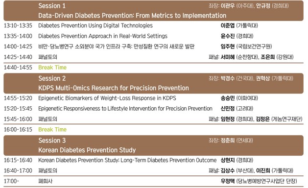 국내 10여개 의료기관의 교수진이 좌장 및 연자로 참여한다. △데이터로 여는 당뇨병 예방: 지표에서 구현까지 △정밀 예방을 위한 KDPS 다중오믹스 연구 △한국당뇨병예방연구 등 3개 세션으로 진행된다.
