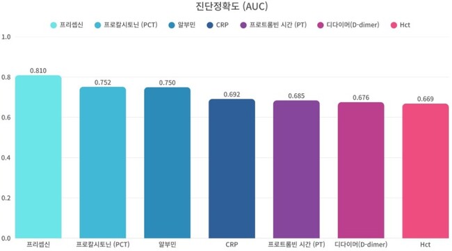 그 결과, 프리셉신의 진단정확도(AUC)가 0.810(0~1, 높을수록 정확)으로 가장 높았다. 이는 시간이 오래 걸리는 혈액배양검사 대신 피검사만으로도 패혈증의 조기진단이 가능하다는 점을 시사한다.