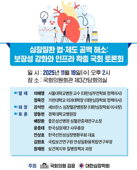 대한심장학회, ‘심장질환 법·제도 공백 해소: 보장성 강화와 인프라 확충’ 국회 토론회 19일 개최