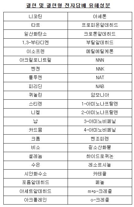 공개 대상 성분은 일반 담배(궐련형 전자담배 포함)가 니코틴·타르·일산화탄소·벤젠 등 44종, 액상형 전자담배가 니코틴·포름알데히드·아세트알데히드 등 20종이다.