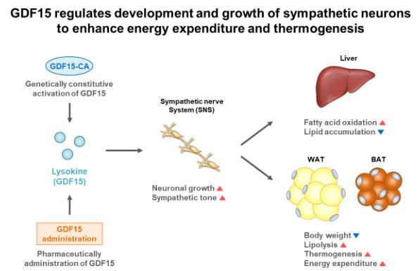 이번 연구에서 연구팀은 GDF15가 단순히 액셀러레이터를 밟는 데 그치지 않고, ‘엔진 자체를 키우는’ 역할, 즉 교감신경세포의 성장과 발달을 촉진한다는 사실을 새롭게 밝혀냈다. 교감신경은 체내 에너지 소비를 조절하는 신경망으로, 지방세포에 신호를 보내 열을 발생시키거나(열생성, thermogenesis), 에너지를 소모하게 만드는 역할을 한다.