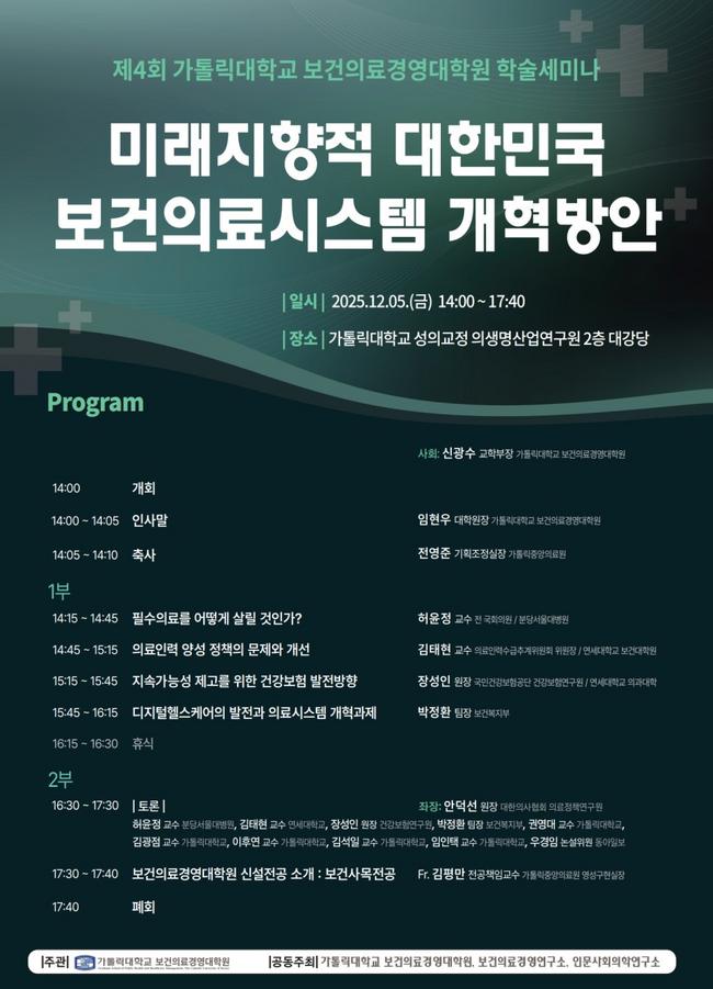 가톨릭대 보건의료경영대학원은 오는 12월 5일 보건의료경영연구소, 인문사회의학연구소와 공동으로 ‘미래지향적 대한민국 보건의료시스템 개혁방안’을 주제로 학술세미나를 개최한다.