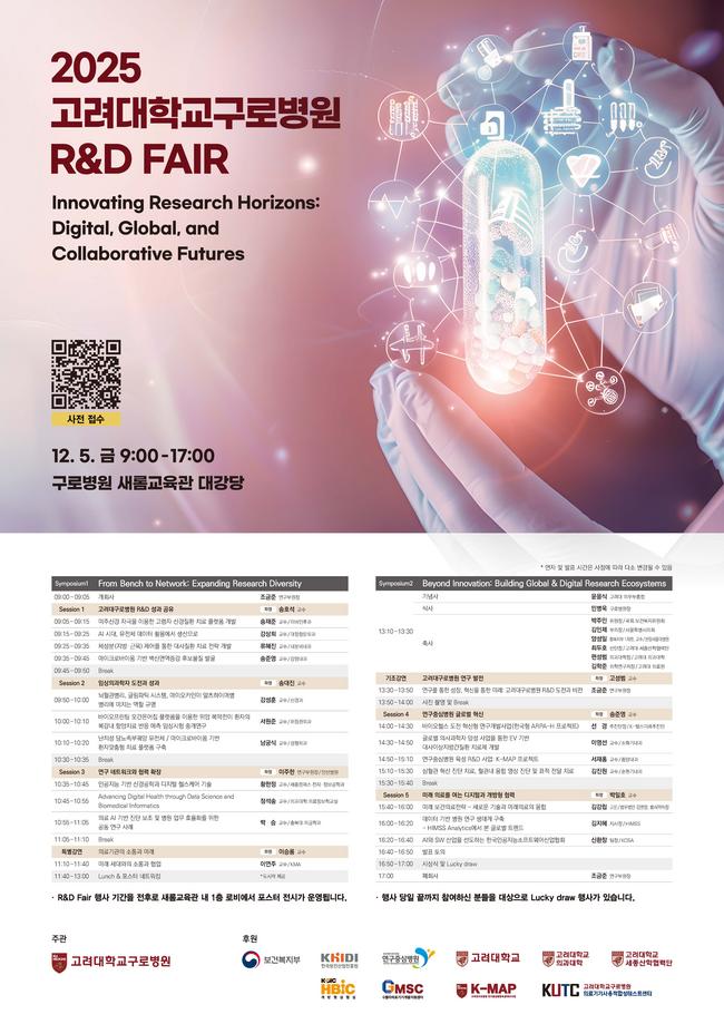 고려대 구로병원이 12월 5일 새롬교육관에서 ‘2025 고려대학교구로병원 R&D FAIR’를 개최한다. ‘Innovating Research Horizons: Digital, Global, and Collaborative Futures’를 주제로 열리는 이번 R&D Fair는 병원의 연구성과를 공유하고 향후 연구개발(R&D) 전략을 논의하기 위해 마련됐으며, 기초·임상·디지털헬스 전 분야를 아우르는 발표와 글로벌 연구 협력 확대를 위한 프로그램으로 구성됐다.
