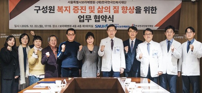 이재협 서울시 보라매병원장(오른쪽에서 다섯 번째), 길해연 한국연극인복지재단 이사장이 상호 협력 협약을 맺고 있다. 서울시 보라매병원은 지난 22일 한국연극인복지재단과 업무협약(MOU)을 체결했다. 협약에 따라 양 기관은 의료와 문화예술 분야가 각자의 전문성을 바탕으로 상호 협력해 환자·임직원·예술인의 복지 증진과 삶의 질 향상에 노력키로 했다.