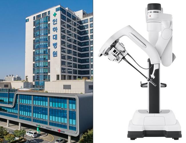 인하대병원 전경, 인튜이티브서지컬社 단일공 로봇수술기 ‘다빈치SP’ (왼쪽부터)