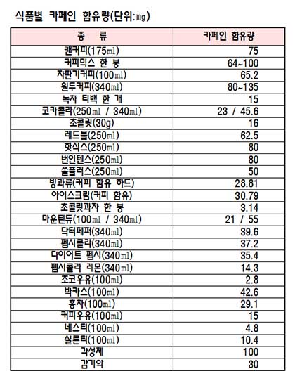 통상 체중 50㎏ 청소년의 카페인 하루섭취권장량은 125mg으로 하루에 커피 한잔(69mg)과 에너지드링크 한캔(62.5mg)만 마셔도 권장량을 초과한다. 카페인을 과량 섭취하면 불면증ㆍ신경과민ㆍ메스꺼움ㆍ구토ㆍ빈맥ㆍ정신착란ㆍ식욕부진ㆍ불안ㆍ근육경련ㆍ심계항진 등의 부작용이 나타날 수 있으므로 주의가 필요하다.
