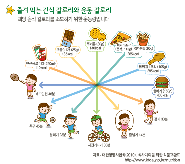 “햄버거 하나(150g, 400㎉)를 먹고 이를 태우려면 배드민턴을 48분간 해야합니다”.