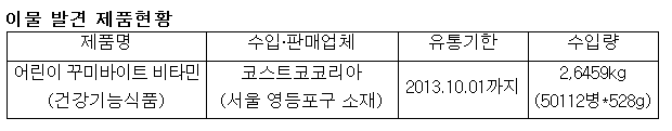 식품의약품안전청은 코스트코코리아가 수입 유통·판매한 건강기능식품 ‘어린이 꾸미바이트 비타민’에서 금속성 이물질이 발견돼 원인을 조사 중에 있다고 22일 밝혔다. 이번에 발견된 이물질은 약 8㎝ 길이의 얇은 실 형태의 금속성 이물로 해당 제품을 관통해 박혀 있는 상태였다.
