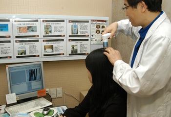 김정득 우리들의신경외과 원장이 현미경으로 두피 및 모발상태를 파악하고 있다.