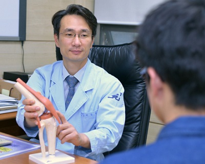 김종구 군포병원 관절클리닉 정형외과 과장이 환자에게 무릎관절의 구조와 관련 질환에 대해 설명하고 있다.
