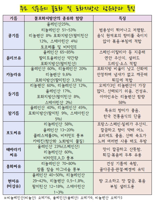 주요 식용유의 불포화 및 포화지방산 함유량과 특징