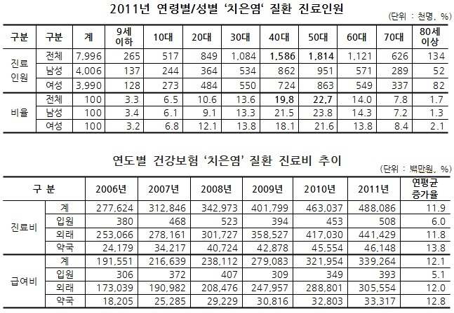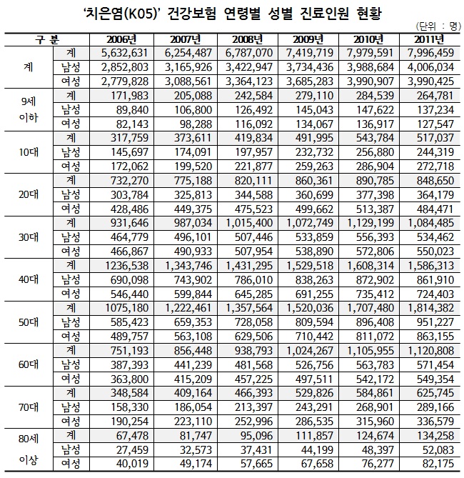 국민건강보험공단은 최근 6년간(2006~2011년) 치은염 관련 건강보험 진료비 지급자료를 분석한 결과 진료인원은 2006년 563만명에서 2011년 800만명으로 늘어나 연평균 7.3%의 증가율을 보였다고 13일 밝혔다.남성은 2006년 285만명에서 2011년 401만명으로 연평균 7.0%씩, 여성은 2006년 278만명에서 2011년 399만명으로 연평균 7.5%씩 늘었다.