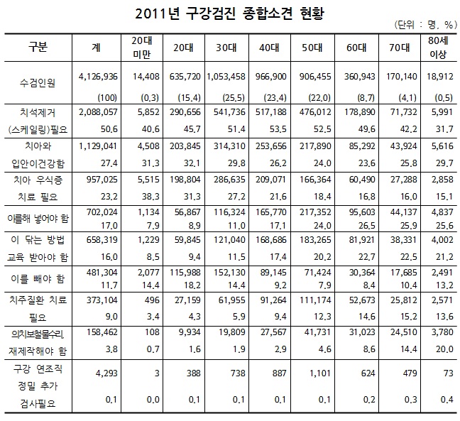 건강보험공단 2011년 건강검진통계연보의 ‘구강건강검진’ 결과에 따르면 전체 수검자 413만명 중 ‘치석제거(스케일링)가 필요한 경우’는 208만명(50.6%), ‘치아우식증 치료가 필요한 경우’는 95만명(23.2%), ‘치주질환 치료가 필요한 경우’는 37만명(9.0%)으로 나타났다.