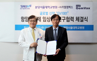 정진엽 분당서울대병원장(왼쪽)과 김상재 카엘젬백스 대표가 임상연구 협력계약을 체결한 뒤 사진촬영을 하고 있다.