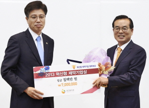 조순태 녹십자 사장(오른쪽)이 13일 경기도 일산 킨텍스에서 열린 ‘바이오코리아 팜페어’ 시상식에서 이영찬 보건복지부 차관으로부터 ‘2013 혁신형 제약기업상’을 받고 있다.