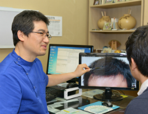 김정득 대구 우리들의신경외과 원장이 탈모 환자와 치료법에 대해 상담하고 있다.