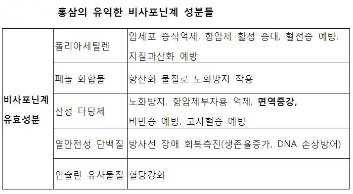 홍삼은 식약처로부터 면역력 증진, 피로개선, 혈소판 응집억제를 통한 혈액흐름 개선, 기억력 개선, 항산화효과 등 5가지의 기능성(효과)을 인정받았다. 이런 기능성은 홍삼에 함유되어 있는 사포닌계(진세노사이드)과 비사포닌계(함질소화합물, 알칼로이드, 다당체, 무기물, 핵산 등)의 다양한 물질들이 종합적이고 조화로운 상호작용을 통해 나타나는 현상이다. 따라서 특정 성분 함량만을 강조하는것은 소비자가 오해할 수 있는 정보를 제공하는 것과 다름없다.