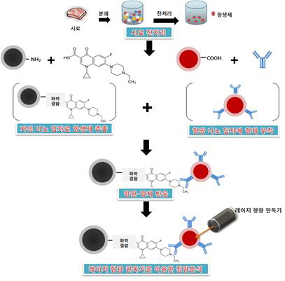 항생제 농도 측정은 △시료에 자성 나노입자를 넣어 항생제만을 추출(A1) △형광 나노입자에 항체 부착(A2) △A1와 A2를 결합해 항원·항체반응을 일으킴 △레이저 형광판독기 분석 단계로 나뉜다.