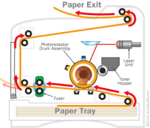 레이저프린터는 출력 속도가 빠르고 잉크젯프린터와는 달리 번지는 현상이 없어 사무실은 물론 가정에서도 사용할 만큼 널리 보급됐다. 하지만 레이저프린터는 잉크 대신 토너라는 탄소가루를 이용해 인쇄하므로 여기서 나오는 미세물질이 건강에 해로울 수 있음을 유념해야 한다. 레이저프린터는 레이저 조사(照射)를 통해 인쇄할 이미지나 글자에 맞게 탄소입자를 드럼이라는 금속 원통에 달라붙게 만들고, 이어 정전기를 이용해 종이에 압착시킨 뒤 열을 가해 굳히는 방식으로 인쇄한다. 복사기도 토너를 사용한다는 점에서 유사한 방식으로 작동한다.