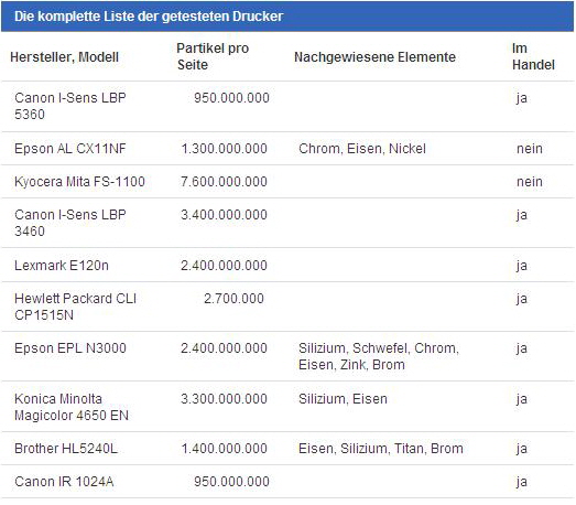 이 정보에 의하면 코니카미놀타의 ‘Magicolor 4650EN’ 모델이 A4용지를 한 장 인쇄할 때마다 규소와 철을 포함한 33억개의 나노입자를, 엡손 ‘EPL N3000’은 규소·유황·크롬·철·아연·티타늄·브롬 등의 나노물질 24억개를 공기 중에 배출하는 것으로 나타났다. 또 브라더의 ‘HL5240’도 철·규소·티타늄·브롬 등 14억개의 나노미세물질을 배출했다.