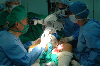 심영기 연세에스병원장(앞줄 왼쪽)이 림프부종 환자에게 미세림프·줄기세포수술을 실시하고 있다.