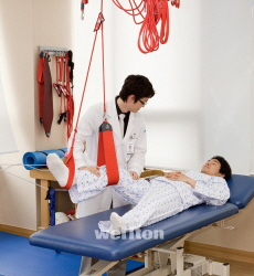 웰튼병원 의료진이 고관절질환 환자에게 재활치료를 실시하고 있다.