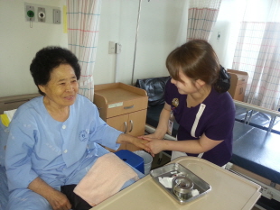 강남힘찬병원 의료진이 수술 후 거동이 어려운 환자를 간병하고 있다.