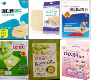 한국먼디파마 ‘메디폼’(상단 왼쪽부터 시계 방향으로), 보령제약 ‘듀오덤’, 일동제약 ‘메디터치’, 대웅제약 ‘이지덤’, 종근당 ‘솔솔플러스’, 광동제약 ‘더마터치’ 등 습윤 드레싱재 제품