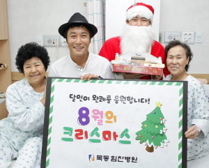 목동힘찬병원은 개원 8주년을 맞아 20일 ‘8월의 크리스마스’ 행사를 진행했다. 이날 오전 11시부터 산타로 분장한 봉사자가 100여명의 입원 환자를 찾아가 선물을 전달했다. 병원 홍보대사인 개그맨 김병만 씨는 산타와 함께 환자들을 위로하고 그를 모델로 한 ‘투마리치킨’을 전달했다.