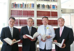 김양수 한빛예술단 이사장(왼쪽부터), 안찬수 책읽는사회문화재단 사무처장, 오병희 서울대병원장, 이영술 씨가 지난 22일 서울대병원 함춘서재에서 열린 시각장애인을 위한 서가대 설치 기념행사에서 사진을 찍고 있다.