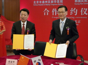 장국봉 신화병원장(왼쪽)과 박영국 경희대치과병원장이 지난 19일 중국 베이징 신화병원에서 교류협력 활성화를 위한 업무협약을 체결하고 있다.