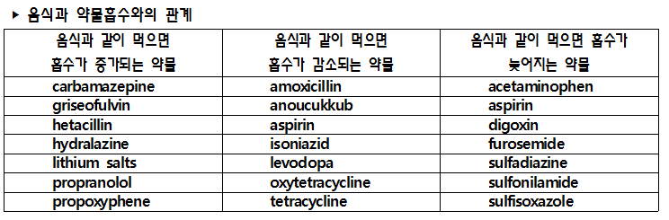 일상생활에서 자주 이용하는 복용법은 대부분 경구투여다. 경구투여란 약을 소화기관으로 삼켜 점막에서 흡수되게 하는 방법으로 음식과 밀접한 상호작용을 한다. 약물의 흡수에 영향을 주는 요인으로 위장관내 pH의 변화, 위 배출시간의 변화, 복합체 형성을 들 수 있다. 우유, 산성음료, 제산제 등은 위의 pH를 바꾼다. 보통 약물은 십이지장으로 이동된 뒤 흡수되므로 위 내에 음식물이 있으면 십이지장 운동 속도가 느려져 약물 흡수 속도에 영향을 줄 수도 있다. 위 내에 있는 음식물이 약물 성분과 반응해 불활성 복합체를 만들어 약효를 감소시키기도 한다.