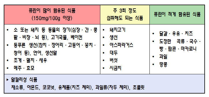 ▷ 통풍은 요산나트륨 결정이 관절과 연골에 침착되는 요산대사 이상으로 요산이 과다 생성되거나 요산 배설이 부족해서 생기는 대사성 질환이다. 통풍약은 대게 요산의 생성을 억제하고 배설을 촉진한다. 콜키신(colchicine), 비스테로이드성 소염(NSAIDs), 알로푸리놀(allopurinol), 프로베네시드(probenecid), 설핀피라존(sulfinpyrazone) 등이 있다. 통풍약과 함께 등푸른생선, 베이컨, 간, 조개, 멸치 등 퓨린이 많은 음식을 과다 섭취할 경우 요산의 농도가 증가해 통풍이 악화될 수 있다. 반면 채소류, 아몬드, 코코넛, 과일류, 초콜릿 등 알칼리성 식품은 소변을 알칼리화해 소변에 요산을 더 많이 녹게 하므로 약물 치료 효과를 높이는 데 도움이 될 수 있다. 물을 많이 마시면 요산 결정이 수월하게 배설되므로 물을 많이 먹는 게 좋다.