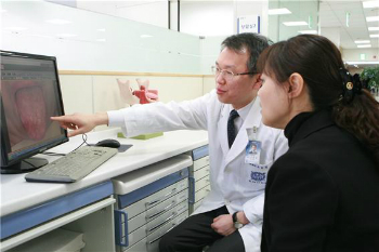 고홍섭 서울대치과병원 구강내과 교수가 여성 환자에게 ‘구강작열감증후군’을 설명하고 있다.