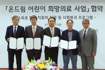 승기배 가톨릭대 서울성모병원장(왼쪽부터), 유영학 현대차 정몽구재단 이사장, 정남식 연세대의료원장, 김석화 서울대어린이병원장, 한상원 세브란스어린이병원장이 17일 ‘온드림 어린이 희망 의료사업’ 2차협약을 체결하고 있다.