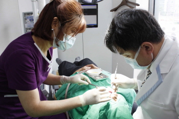 이성찬 대구 진천 룡플란트치과 원장(오른쪽)이 임플란트시술을 시행하고 있다.