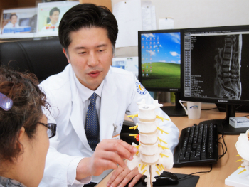 김헌 강남 연세사랑병원 척추센터 과장이 환자에게 척추압박골절을 설명하고 있다.
