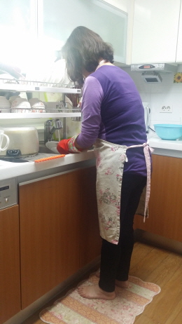 설거지를 할 땐 싱크대와 허리 높이를 맞추는 게 중요하다. 키가 큰 사람은 양 발을 넓게 벌려 허리를 숙이지 않도록 한다. 키가 작은 사람은 발 받침을 두고 설거지를 하는 게 좋다.핵또 주방에서 장시간 서서 일할 때 바닥에 목침을 놓고 한쪽 다리를 번갈아 올렸다 내리면 허리에 무리가 덜 간다. 송주현 병원장은 “음식 장만을 마친 뒤 따뜻한 물로 반신욕을 하거나 수건을 덥혀 통증이 나타나는 관절 부위에 찜질을 해주면 증상 완화에 도움된다”고 말했다.