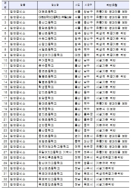 올 상반기 식품위생법 위반으로 적발된 학교·매점·집단급식소 식품판매업체 86곳